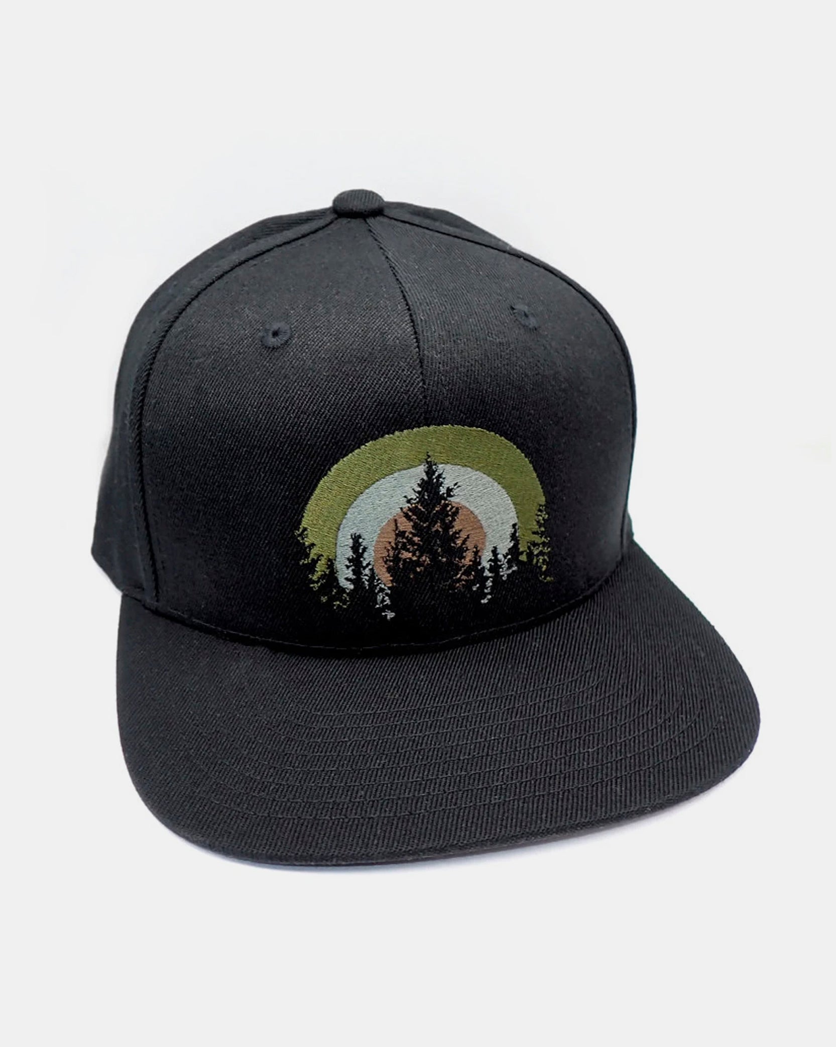 This nature themed hat features all the options to make it the perfect fit, snapback, fitted, curved and flat bills with our forest landscape illustration stitched out front and center! It features a colorful retro styled background with a pine tree forest knocking out of it!