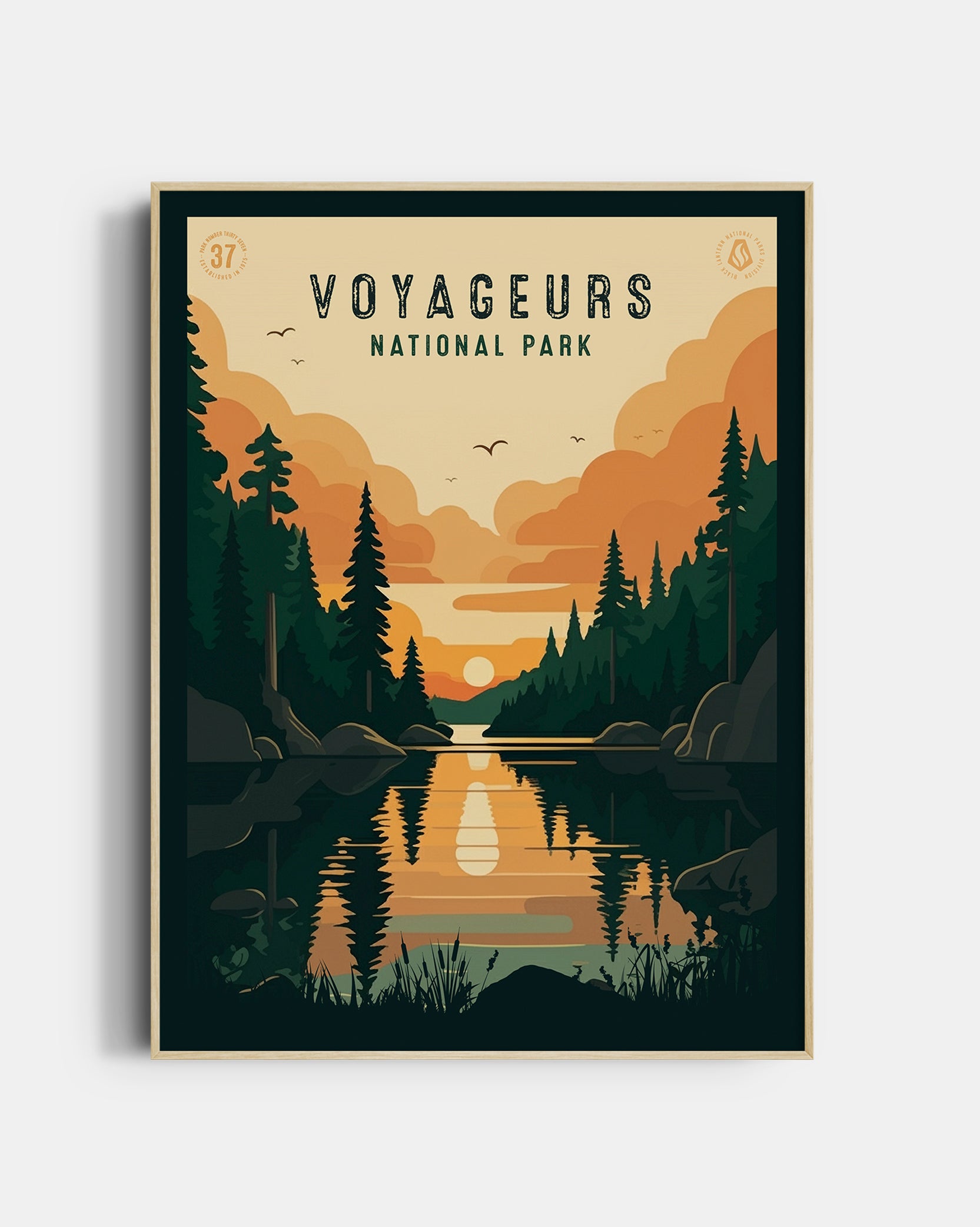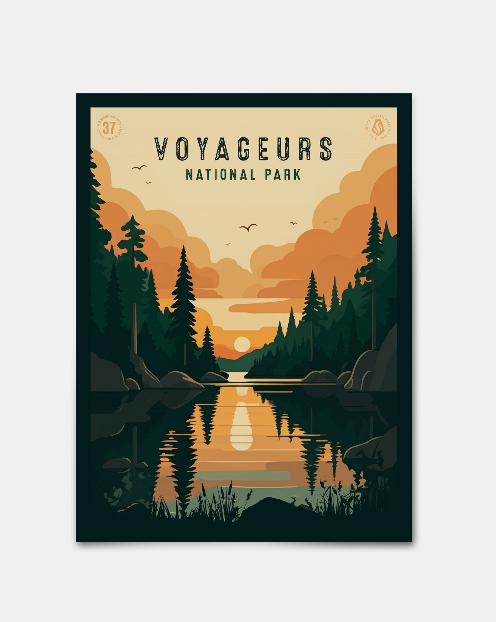 Experience the serene beauty of the Northwoods with our Voyageurs National Park Poster, a tribute to the pristine lakes, lush forests, and boundless skies that define this remote wilderness. Designed with a rich earth-tone palette and clean geometric elements, this poster captures the tranquil spirit of Voyageurs, where water and wild meet in perfect harmony. Perfect for adventurers, kayakers, and nature lovers, this artwork brings the peaceful essence of the park into your space.